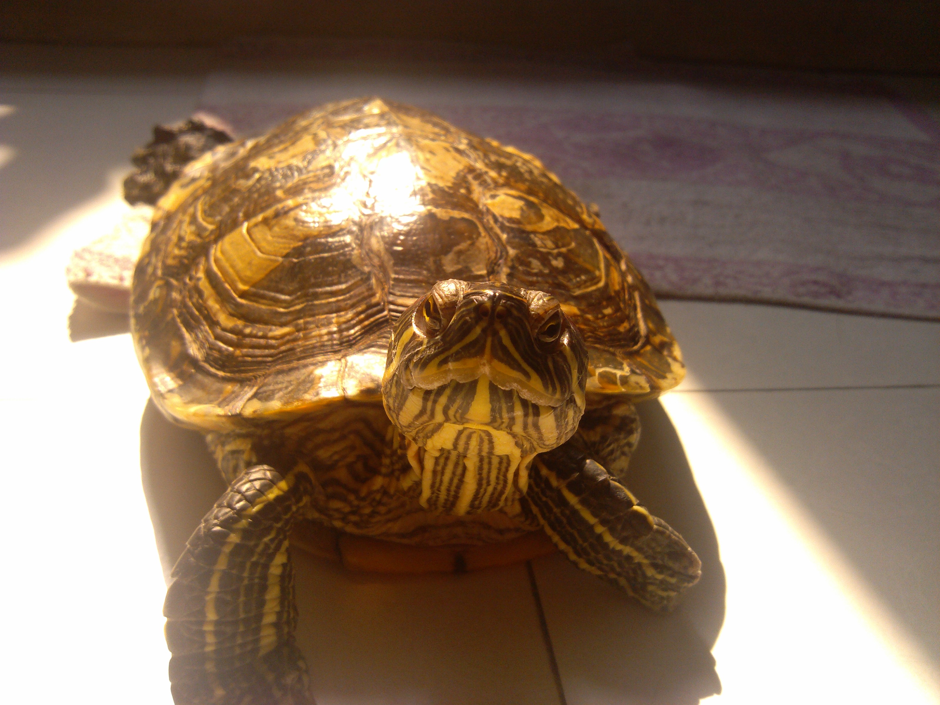 The turtle has been in the apartment for more than 10 years, I can't even remember when we bought it. It has laid several eggs, so I think it's a female. It likes to hide in the quilt during the winter. One day, my Mom didn't notice it was hiding in the quilt and took the quilt out to the balcony to get some sunsine. It fell from the balcony to the ground and broke its shell. Luckily, it survived.